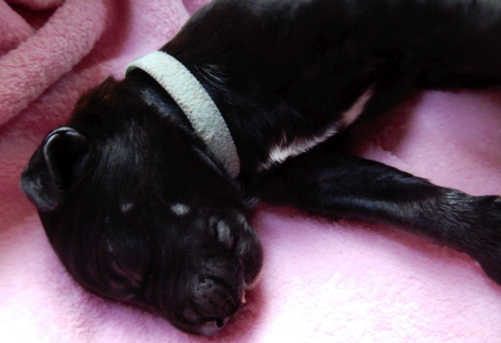 Türkis: Hündin, 489g, 22.46 Uhr, Schwarz mit weißem Brustfleck und graue Zehen hinten